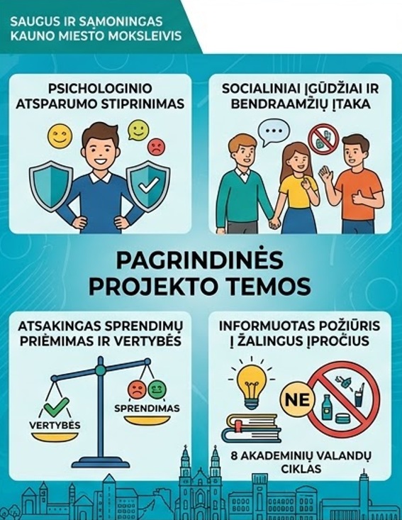 Šis projektas prisideda prie saugios, sąmoningos ir sveiką gyvenimo būdą puoselėjančios Kauno miesto mokyklų bendruomenės kūrimo.